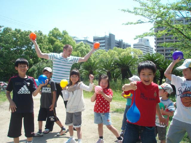 都島区eo英会話です。5月30日の野外パーティーにたくさん参加していただきありがとうございました。青空の下で緑に囲まれながら、子どもも大人も焼きたてのソーセージのホットドッグをおいしくいただきました。ランチの後は、おまちかね、water balloons throwing 水風船合戦 !!子どもたちとケリーもコリーも全身びしょぬれ~!! 楽しかったね!!写真は→→ホットドッグパーティ写真