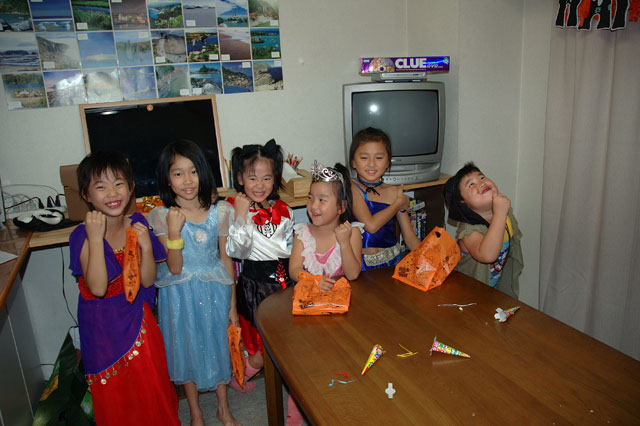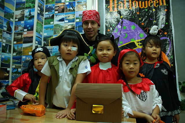 今年のハロウイーンは海賊に変身してトレージャーハント(宝物探し)をしました。いつもの教室が海賊船長の不気味な船室に大変身。今までに習った英語を使わないと宝の地図が読めません。みんな必死で単語を思い出しながら、隠してある宝物(ハロウイーンのお菓子)を見つけることができました。昨年のお化け屋敷を思い出して、今回の船長の部屋に入るのが怖かった子もいました。3歳の子たちは、変装したケリーにビビってました。